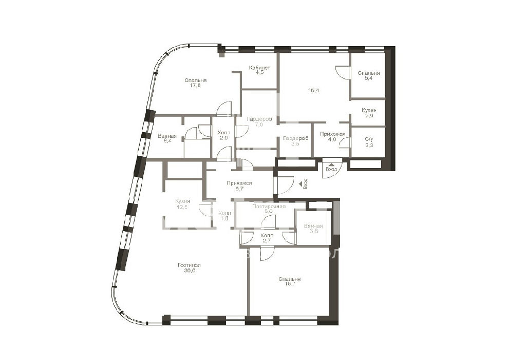 Функциональная планировка включает в себя гостиную, кухню с обеденной зоной, мастер спальню с кабинетом, ванной и гардеробной комнатами, детскую спальню с ванной комнатой, третью спальню, при которой есть свой кабинет, гардеробная, кухня и ванная комната. При необходимости эти помещения могут использоваться как отдельная квартира.